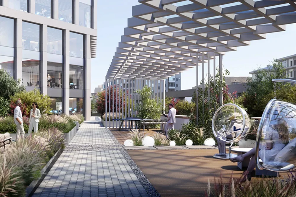 Самые передовые бизнес-центры имеют открытые террасы, где сотрудники могут расслабиться и пообщаться с коллегами на свежем воздухе. Такая, например, предусмотрена на крыше стилобата, соединяющего два здания в бизнес-центре Dubinin’Sky, который реализует компания «Галс-Девелопмент» на территории Павелецкого делового кластера. Просторные озелененные террасы также разместятся на третьем, четвертом, пятом, седьмом и 23-м этажах бизнес-центра. В другом проекте компании, бизнес-центре «Север» в районе Аэропорт, реализовано похожее решение. На крыше стилобата арендатор сможет оформить зоны для работы и отдыха по собственному усмотрению.